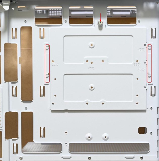 ▼主機板底板後方3.5吋/2.5吋固定板上方使用手轉螺絲(紅色箭頭)固定,下方兩側有卡