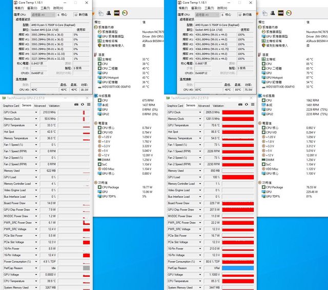 ▼CPU+GPU高負載前(左)及高負載30分鐘後(右)的Core Temp、GPU-Z感測器、AIDA64感測