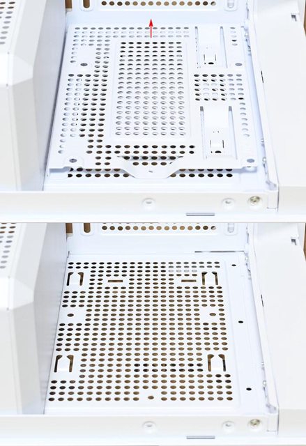 ▼位於機殼底部的固定螺絲拆除後,底部前方風扇固定板可以往紅色箭頭方向滑動取下