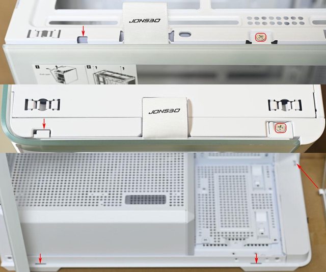 ▼拆卸時,先拆除頂部網孔板及右側板,然後拆除位於頂部的2個固定螺絲(紅框)