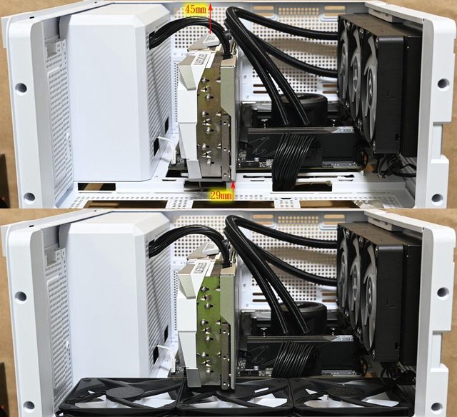 部距離左側45mm,顯示卡底部距離右側前方風扇固定板29mm(上圖)。安裝厚度25mm風扇時