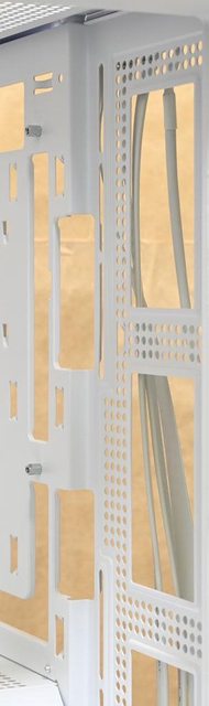 ▼電源艙頂部網狀隔板有3個穿線開口,使用配件隨附長螺絲可安裝2個120mm(紅色/水藍