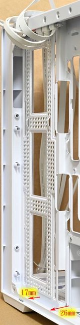 ▼右側前方風扇固定板與右側板距離17mm,主機板底板與右側板距離26mm,交界處側面有