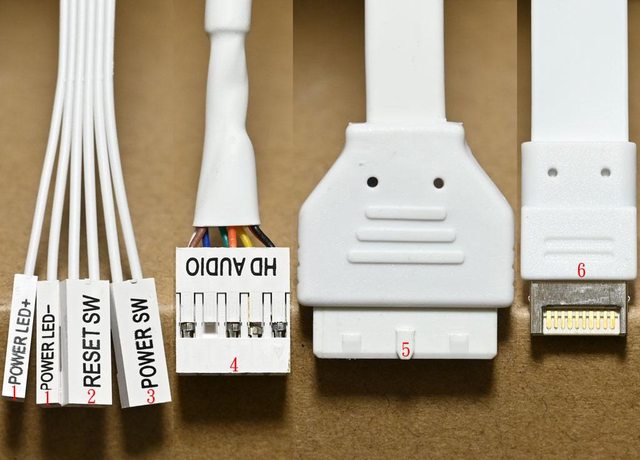 ▼白色機殼連接線組,1為電源指示燈接頭,2為重置開關接頭,3為電源開關接頭,4為耳