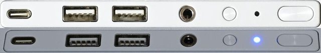 ▼位於頂部右側前方的縱置式I/O埠、按鈕與指示燈,由上(圖左)至下(圖右)分別是