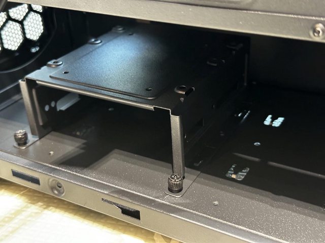硬碟架能裝2顆3.5吋硬碟,有兩段位置可調,前面板裝水冷排則需要移到靠近電源的位置