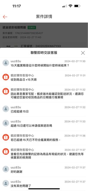 → uuz83u: 店家說要退,但蝦皮客服說鑑賞期過了不能122.118.221.51 02/27 17:22