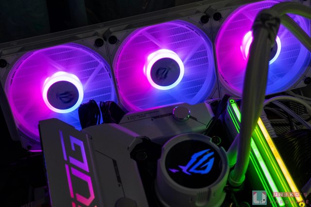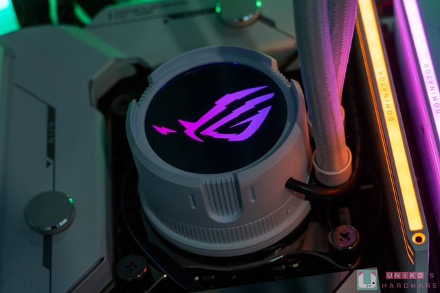 可旋轉水冷頭外,還輔以 ROG ARGB 0db 技術風扇和個人化 Aura 燈效搭配。