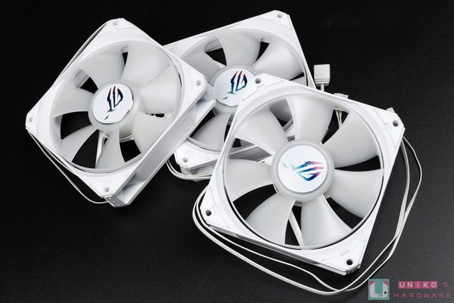 搭配的三組 ROG STRIX AF-12S ARGB 120 mm 風扇,四邊皆有防震橡膠保護,軸承上方都