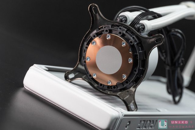 以對應各種安裝角度。內部搭載 Asetek Gen7 V2 幫浦,幫浦馬達轉速為 800 – 2800 ±