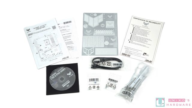 其他配件包括 2 根 SATA 線、快速安裝指南、光碟、TUF 信仰貼紙、TUF 認證卡、2 顆 M.