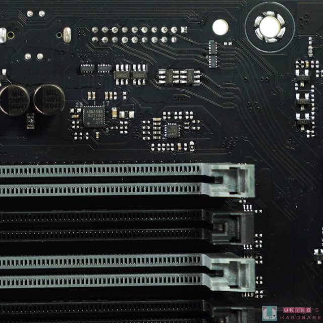 提供 3 根 PCI-E 插槽和 4 根 M.2 插槽,所有 M.2 插槽都配備 Q-LATCH 快拆設計,和黑