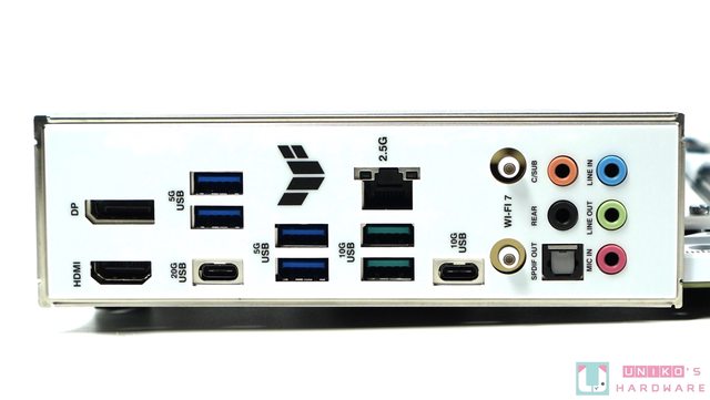 白色的 I/O 檔板採用不鏽鋼設計,有效對抗腐蝕問題,I/O 設計較傾向於 TUF Z790 PRO,