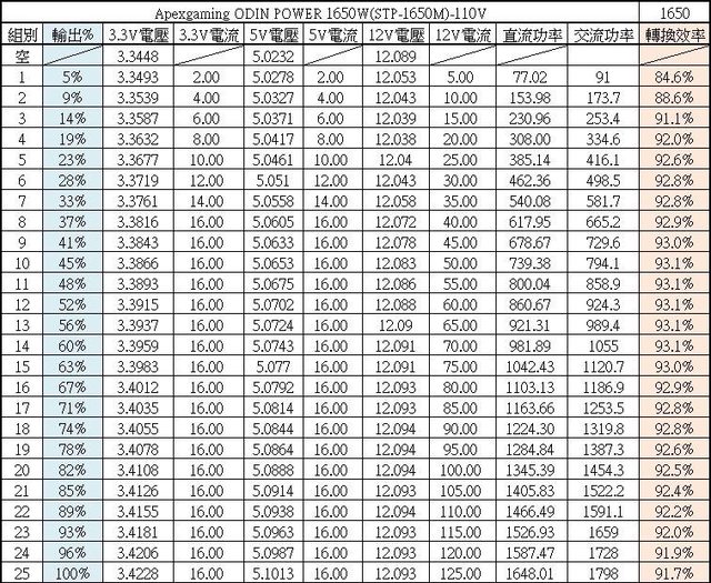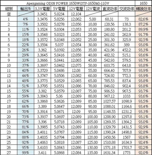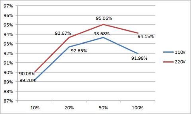 ○110V輸入的20%/50%/100%輸出轉換效率分別為92.65%/93.68%/91.98%,滿足80PLUS白金