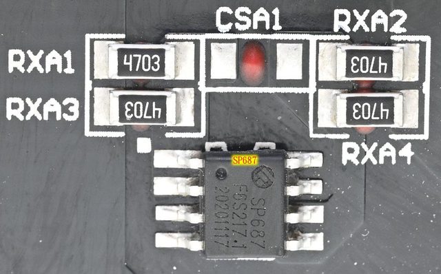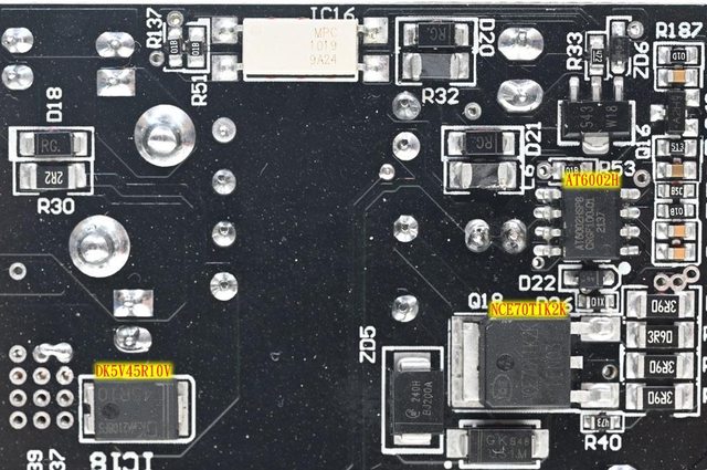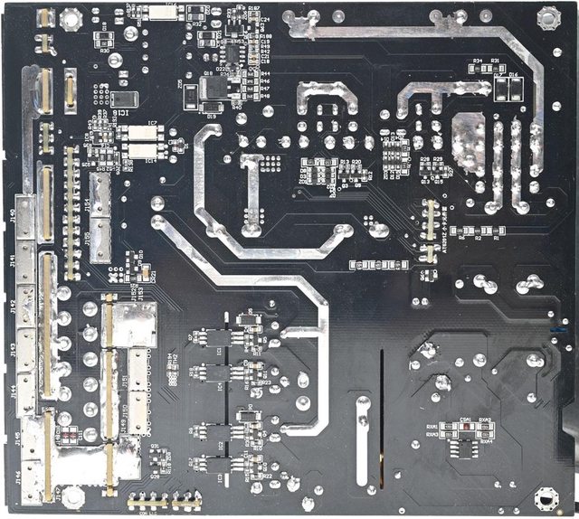 ▼主電路板背面焊點做工良好,於大電流線路敷錫,並在部分二次側區域加裝小塊長方形