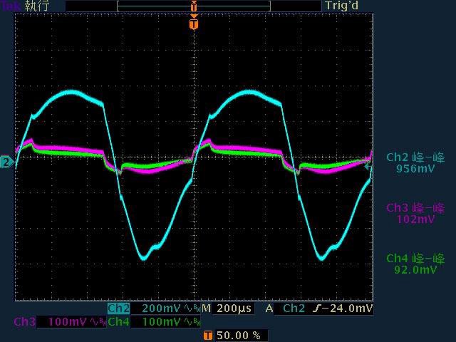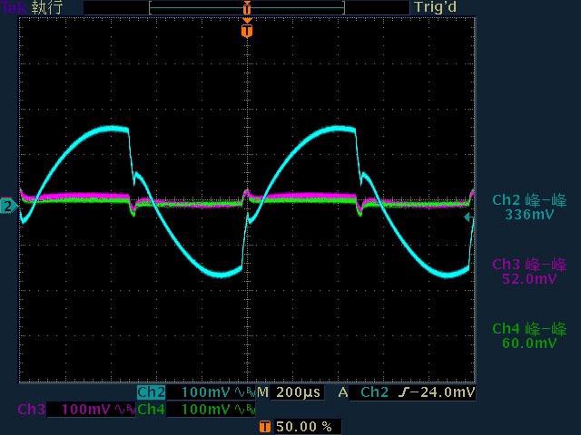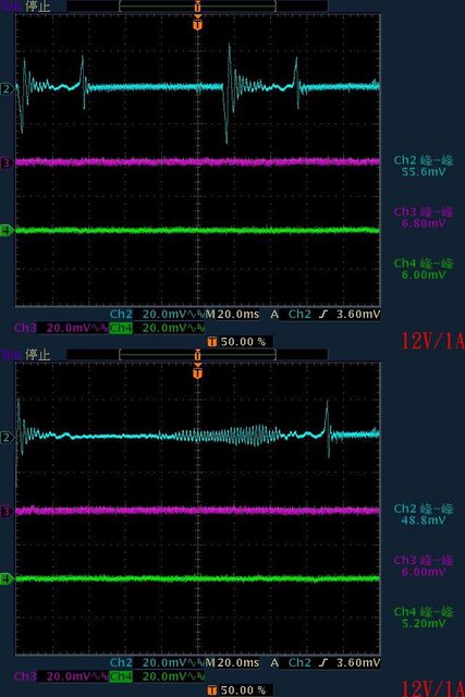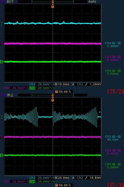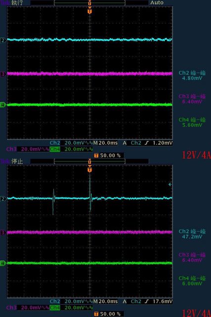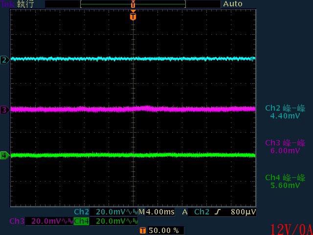○110V輸入下輸出無負載時12V無明顯漣波,輸出12V/1A至12V/4A時12V帶有較大間歇漣波