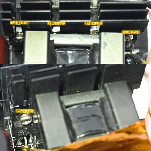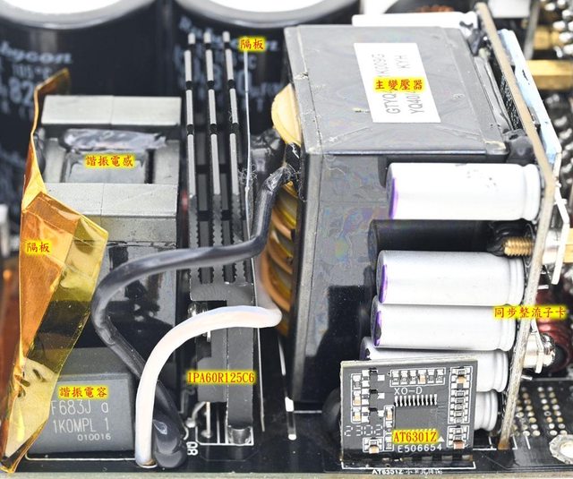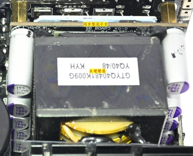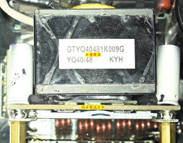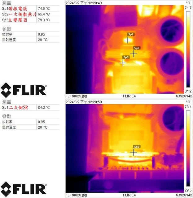 ▼110V輸入時電源供應器滿載輸出下諧振電感/一次側散熱片/主變壓器(上圖)及二次側