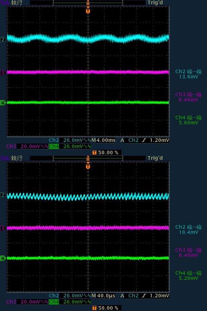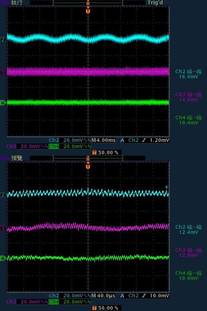 16mV/14mV/10.4mV,於純12V全負載輸出下12V/5V/3.3V各路低頻漣波分別為