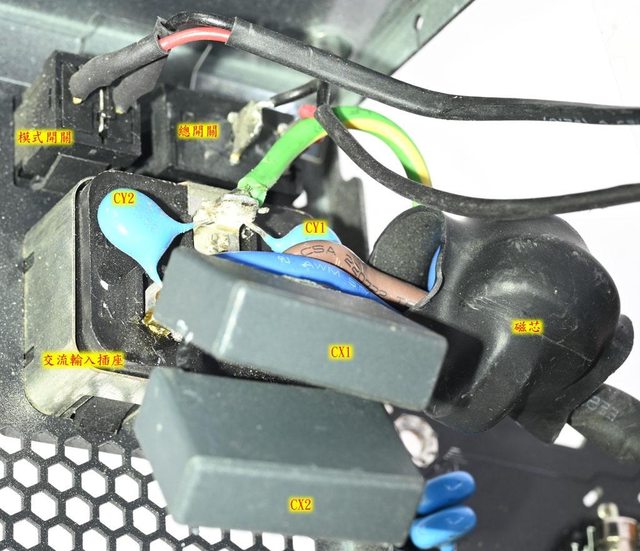 ▼交流輸入插座焊點加上2個Y電容(CY1/CY2)及2個X電容(CX1/CX2)。總開關不控制交流電