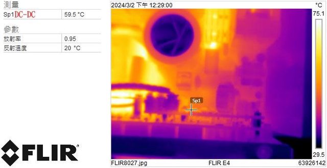 ▼110V輸入時電源供應器滿載輸出下DC-DC的紅外線熱影像圖(附註:安裝位置環境溫度會