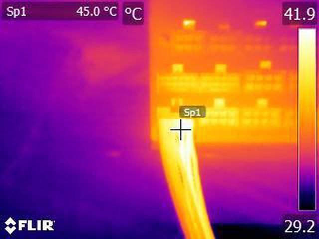 ▼110V輸入時單條EPS 4+4P連續輸出28A(336W)10分鐘後的電源端模組化接頭紅外線熱影