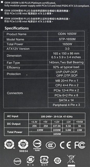 ▼本體背面標籤有Apexgaming商標、ODIN名稱、1650W輸出功率、80PLUS白金認證、型號