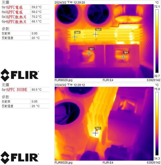 ▼110V輸入時電源供應器滿載輸出下APFC電感/APFC散熱片(上圖)及APFC DIODE(下圖)的