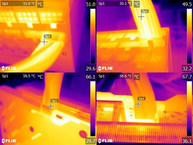 ▼執行FURMARK 30分鐘後電源端插頭(左上/右上)及顯示卡端插頭(左下/右下)的紅外線熱