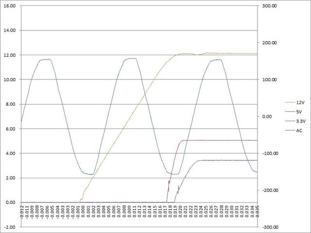○110V輸入下電源啟動至3.3V/16A、5V/16A、12V/120A輸出狀態,12V上升時間20ms,5V