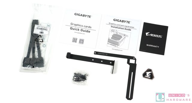 配件除了 PCI-E 8-PIN 轉 16-PIN 外,還有技嘉的顯示卡支撐架、一份快速指南、一份支