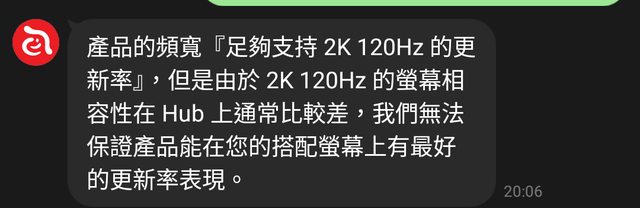結果兜兜轉轉,回到一個很基礎的問題 上面寫著支援4K60 HDMI,那我的2K螢幕接上到底能不能跑到144或至少120啊 我的螢幕是※Acer XV272U V3 有HDMI2.0 電腦是ROG G614JZ 雷電4接口 帶著順路到亞果直營門市去問,說是要把螢幕搬過去才能測試…在測試之前說不準,客服基 本上是這樣說的 https://i.imgur.com/XHP8KLR.png