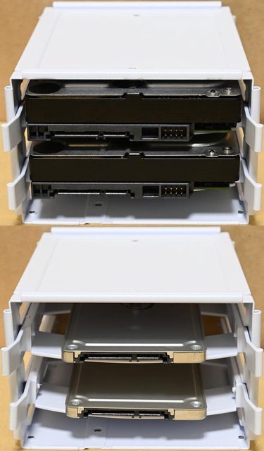 ▼底部3.5吋/2.5吋抽取式固定架安裝2個3.5吋裝置(上)或2個2.5吋裝置(下)示意圖