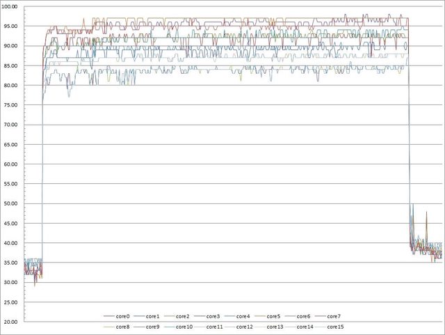 ▼功耗限制300W下高負載30分鐘CORE TEMP溫度記錄圖