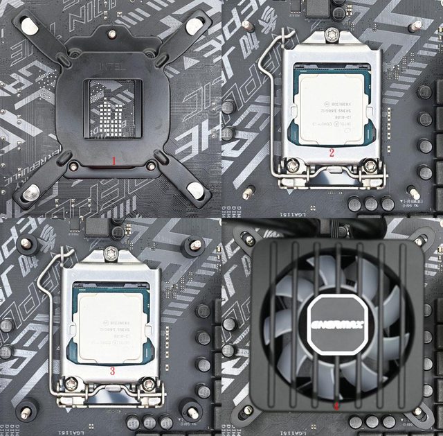 螺柱灰色圓筒那一端朝下鎖入固定鎖點(2)。安裝水冷頭前先確認水管接頭不會與主機板