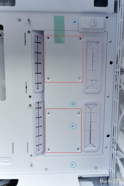 紅框處可安裝2.5吋的硬碟,綠圈處可安裝EEB的主板螺絲銅柱