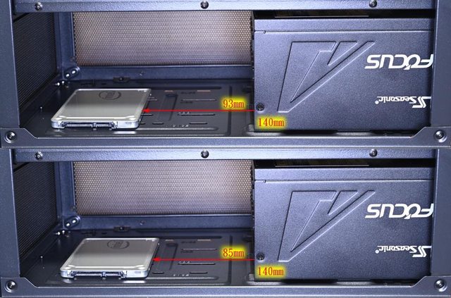 電源供應器左側與2.5吋裝置右側邊緣距離最小85mm,最大93mm