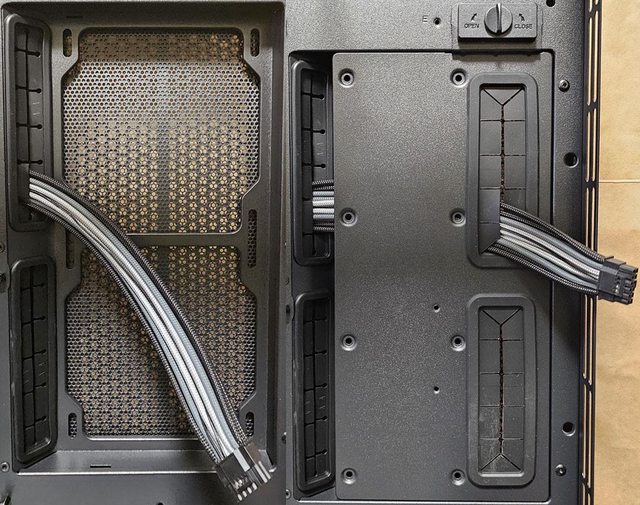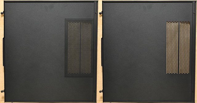 並透過磁吸方式固定。為了避免強化玻璃側板意外開啟,搬動機殼時最好額外黏貼固定