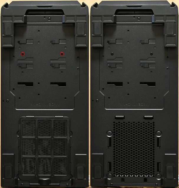 擋板,下方電源供應器安裝位置提供2種安裝方向螺絲孔。右下方2個螺絲(紅框處)為左側
