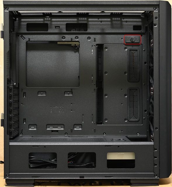 ▼左側下方網孔板取下後,電源艙側面有3個開口。紅框處為右側前方擋板固定旋鈕,逆