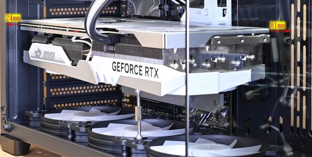 左側距離24mm,顯示卡底部與機殼右側前方風扇架距離81mm