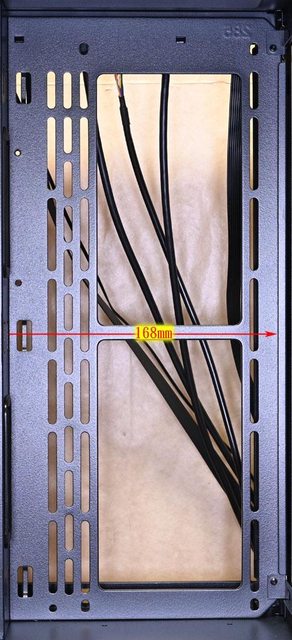 ▼右側前方風扇架寬度168mm,長條形固定孔可裝3個120mm風扇,水冷排可裝280mm