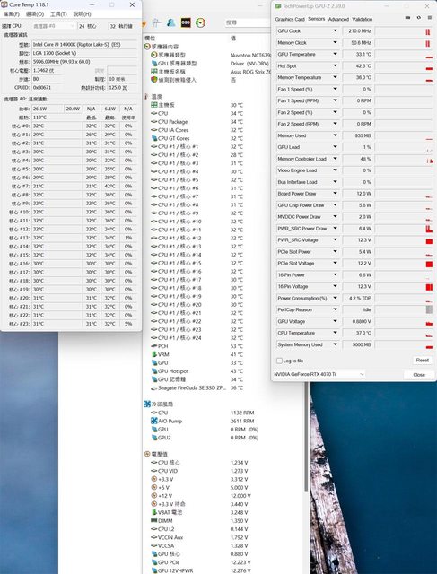 ▼風扇裝在右側前方的CPU+GPU高負載前Core Temp、GPU-Z感測器、AIDA64感測器頁面