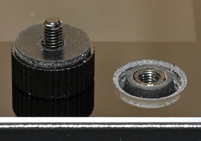 ▼左艙強化玻璃側板打孔處手轉螺絲底部有墊片,螺絲鎖點外有套管