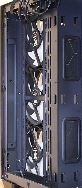▼左艙配置圖,右側前方風扇架預裝3個120mm ARGB從控反向風扇
