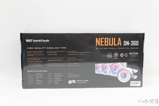 外盒正面型號Nebula DN-360 All in one 360 mm LIQUID CPU Cooler