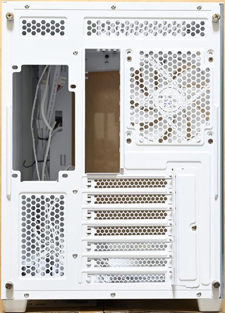 ▼機殼後方,左艙上方通風口可裝1個120mm風扇,水冷排可裝到120mm,左艙下方提供7個