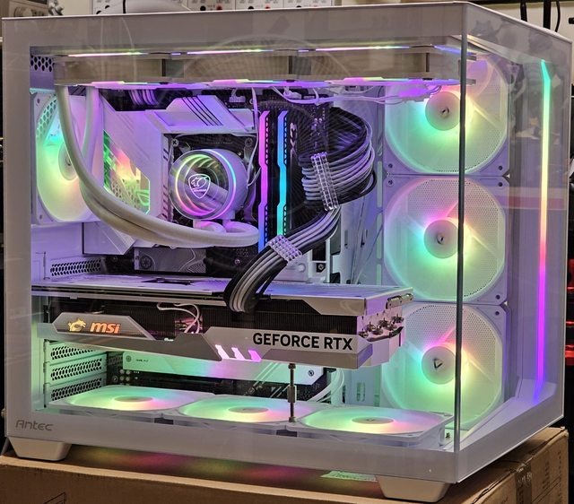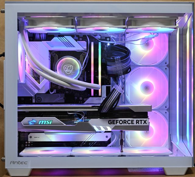 斷層視野讓內部組件一覽無遺。正面邊框配置ARGB燈條,搭配內部發光風扇及其他發光零