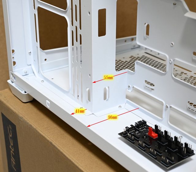 ▼右側前方風扇架與主機板底板之間距離55mm,右側前方風扇架與右側板之間距離41mm,