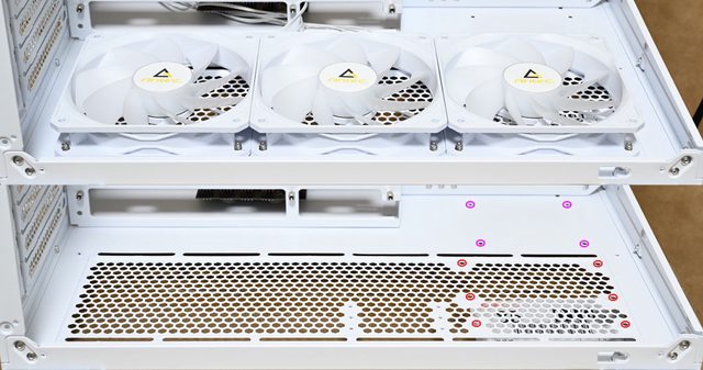 底部風扇安裝空間:3個120mm(預裝3個P12R 120mm PWM反向發光風扇)
