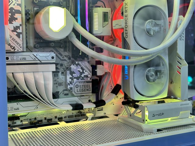 這咖展示機內部有搭配upHere水冷、EZDIY新款轉接頭及十分特別的顯示卡直立支架。